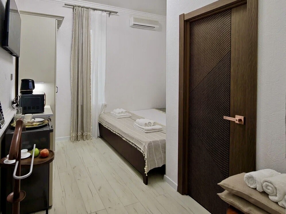 Трехместный номер. Огромная кровать 2400/2500 и спальное место-достархан с прекрасным видом на Кипарисовую аллею.