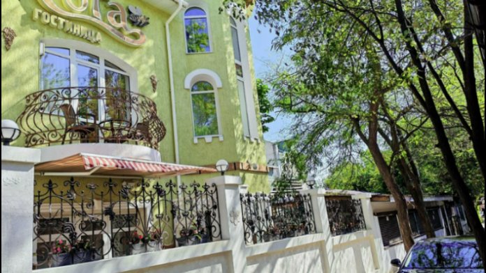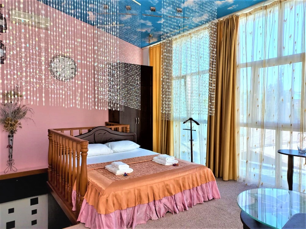 Здание гостиницы построено из экологически чистых материалов с использованием современных строительных технологий, что позволило обеспечить гостям красивый, качественный и комфортный отдых. Территория, внутренний двор гостиницы - ещё одно из её ярких достоинств. Оригинальное решение натяжного потолка, ротанговая мебель, плазменных телевизоров, максимум зелени, фонтан–горка в зоне отдыха, изумительный восточный колорит всей отделки гостиницы – создают атмосферу незабываемого отдыха для всей семьи. Во дворе гостиницы никогда, даже в самую летнюю жару не бывает жарко! Постояльцы гостиницы с удовольствием отдыхают и общаются на свежем воздухе.