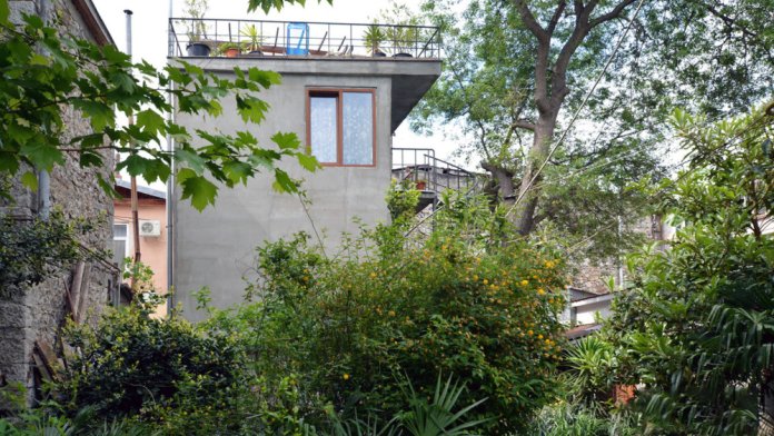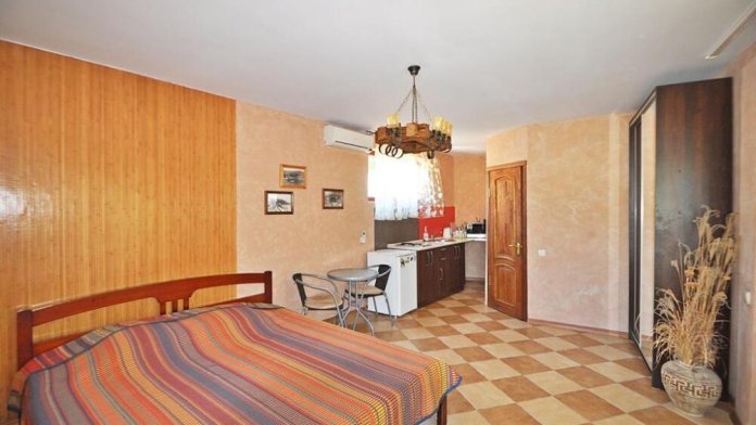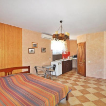 * Номер-студия с панорамной террасой на третьем этаже: комната с маленькой кухней площадью 25 кв. м + санузел (туалет, раковина, душевая кабина).
