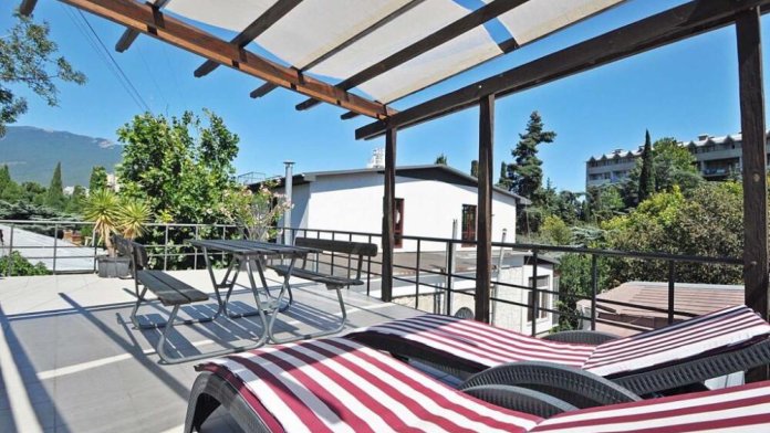 На крыше панорамная терраса с местами для отдыха-стол, скамейки, лежаки с матрасами. Панорамной террасой на крыше пользуются только жильцы номера на третьем этаже.