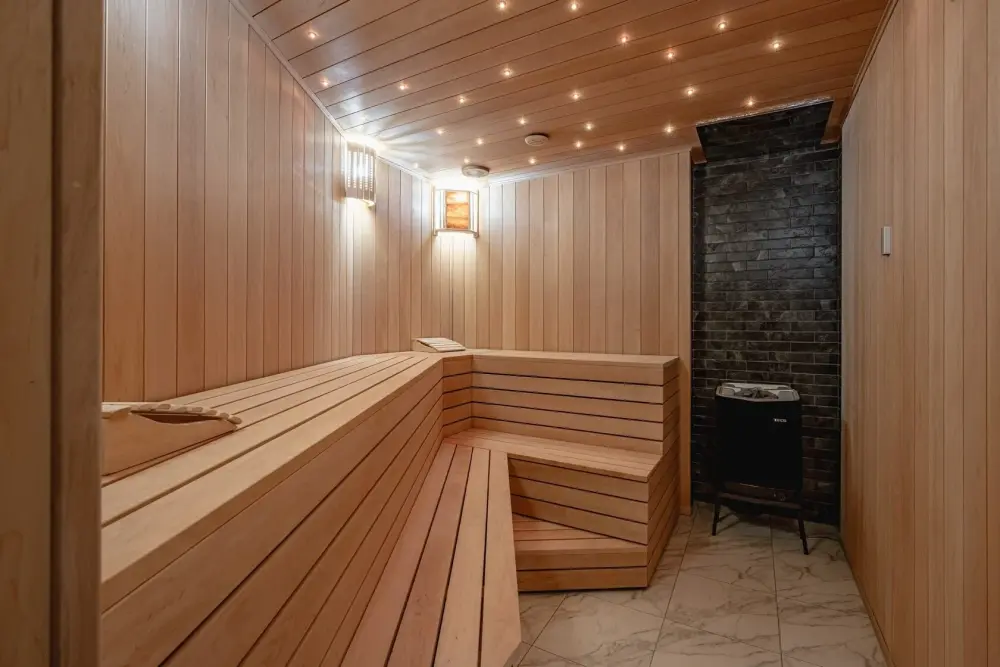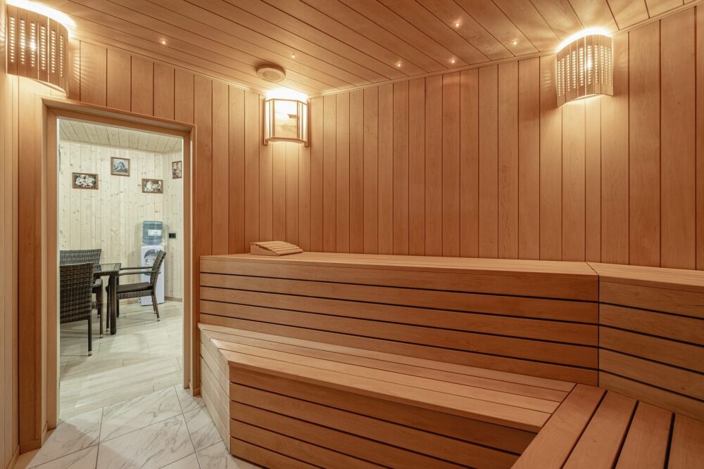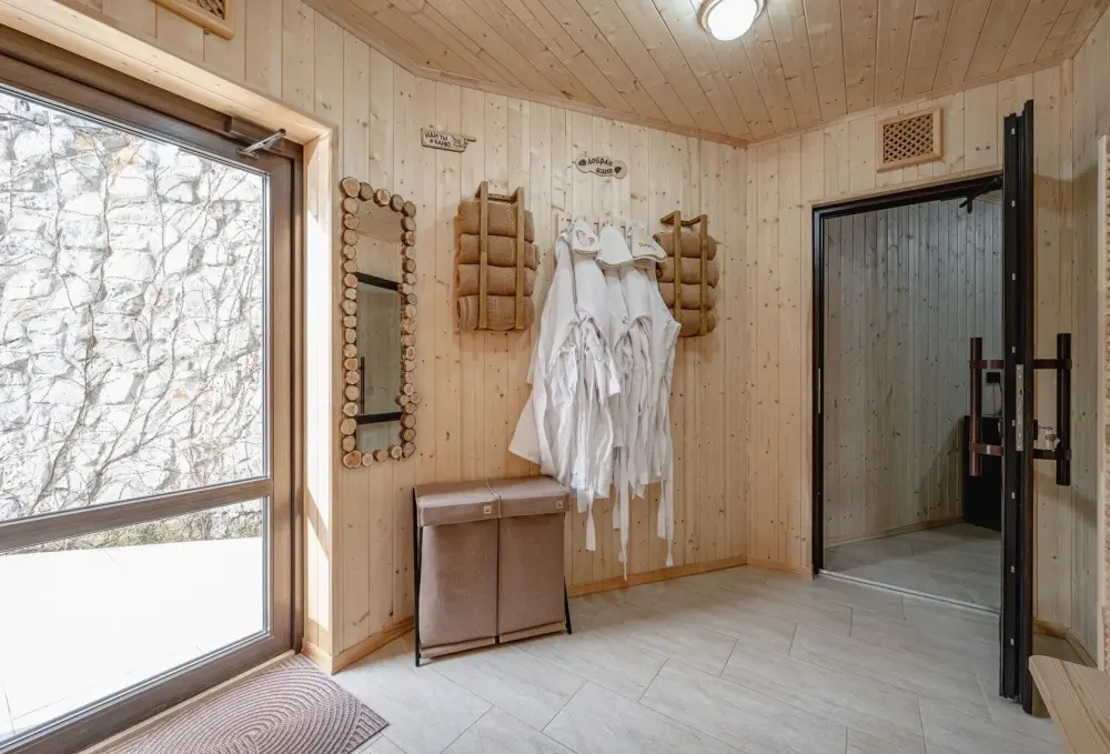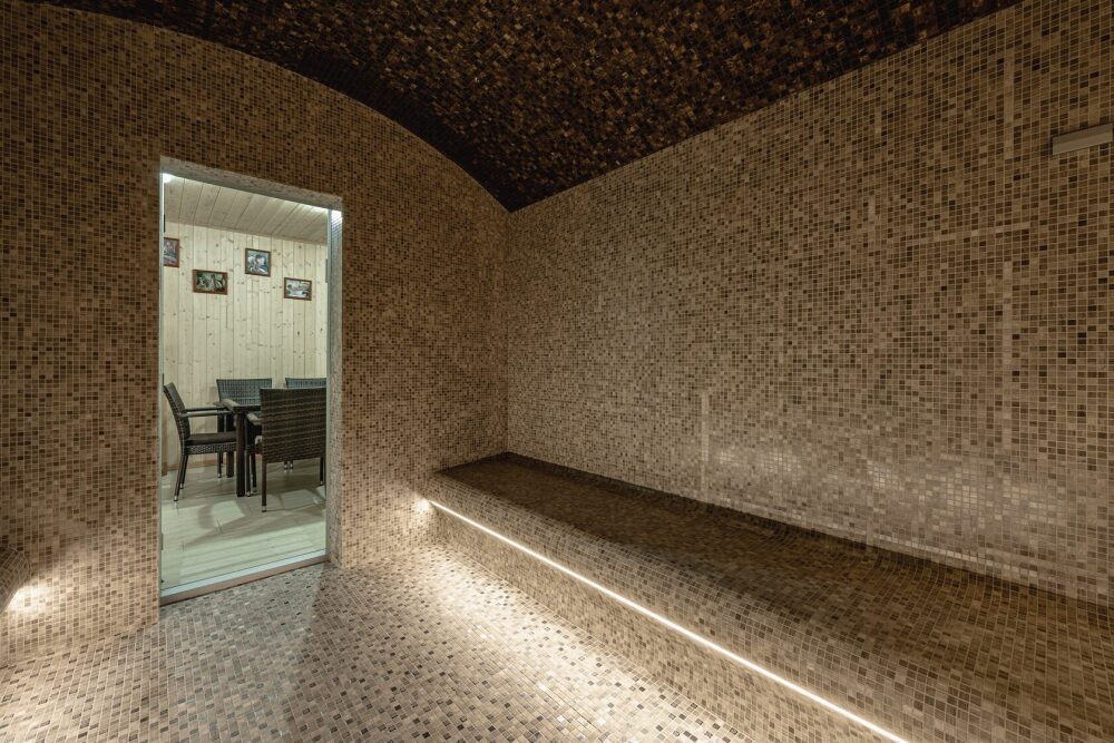 На территории гостевого дома есть общая кухня, которая включает в себя набор необходимой посуды, чайник и микроволновую печь. Во дворе организована площадка барбекю для приготовления мяса и овощей. На территории есть бильярд, а также бассейн, хамам и баня.