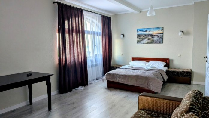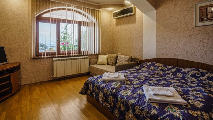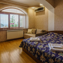 Номер-студия с кухней, террасой с видом на море, раскладным диваном и удобной двуспальной кроватью. Мебель: вешалка, зеркало, пуфик, стол, стулья, шкаф. Мини-кухня: микроволновая печь, мини-холодильник, электрический чайник, набор посуды. Оборудование: кондиционер, телевизор ЖК, интернет Wi-Fi бесплатно. Санузел с душевой кабиной, тапочками и туалетными принадлежностями. Сервис: смена полотенец, смена постельного белья, уборка номера.