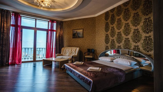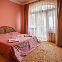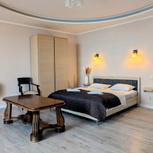 Апартаменты с большим гардеробом и отдельной кухней 12 кв. метров. Мебель: диван, кресло, кровать двуспальная, пуфик, стол, столик журнальный, стулья, шкаф. Мини-кухня: микроволновая печь, мини-холодильник, набор посуды, электрический чайник. Оборудование: кондиционер, телевизор ЖК, интернет Wi-Fi бесплатно. Санузел с душевой кабиной, тапочками и туалетными принадлежностями. Сервис: смена полотенец, смена постельного белья, уборка номера.