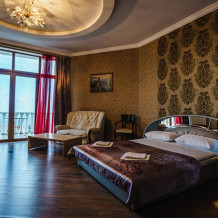 Двухкомнатная квартира с витражными окнами и шикарным видом с террасы на море. Мебель: диван раскладной, зеркало, две двуспальных кровати, пуфик, стол, стулья, тумба. Мини-кухня: микроволновая печь, мини-холодильник, набор посуды, электрический чайник. Оборудование: кондиционер, телевизор ЖК, интернет Wi-Fi бесплатно. Санузел с джакузи, душевой кабиной, тапочками и туалетными принадлежностями. Сервис: смена полотенец, смена постельного белья, уборка номера.