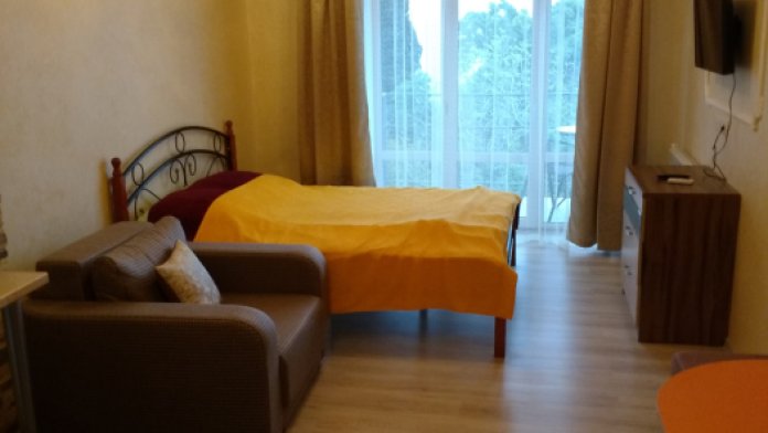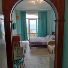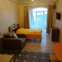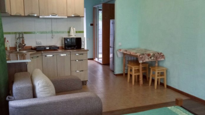 Номера оснащены всем необходимым для отдыха, большая двуспальная кровать и кресло-кровать, есть возможность поставить дополнительное место. ЖК телевизор со множеством каналов не даст заскучать вечером. Кухня в номере имеет газовую плиту, СВЧ, набор посуды, что позволяет готовить изысканные блюда из крымских овощей, фруктов и свежевыловленных морепродуктов.