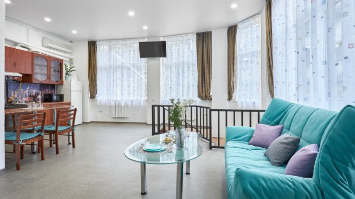 Во-вторых, большие панорамные окна, квартира очень светлая и уютная. С отдельным входом (практически отдельный дом в самом центре города).