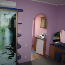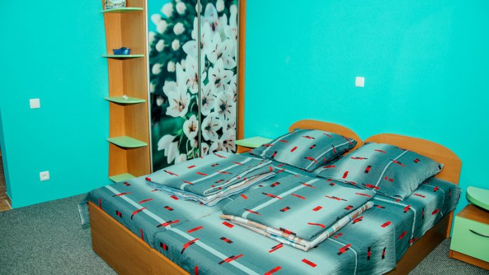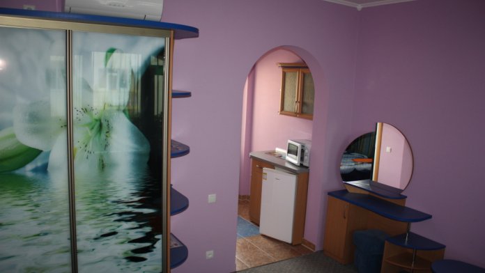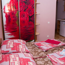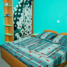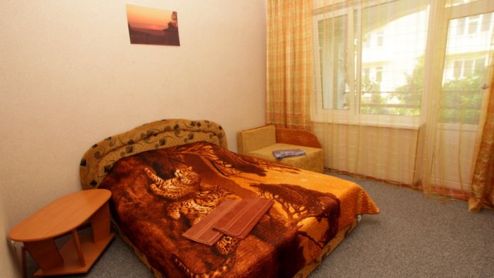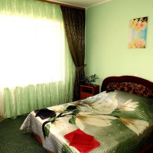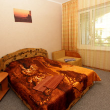 Номер 2-местный с дополнительным местом (большой диван-книжка), расположен на четвертом этаже, имеет отдельный вход. В номере есть душ и санузел (горячая и холодная вода круглосуточно), есть телевизор LCD, кондиционер, холодильник, микроволновая печь, эл.чайник, посуда, сейф. Имеется балкон, где стоит летняя мебель для отдыха, сушилка для белья. Предоставляем постельное белье и полотенца.