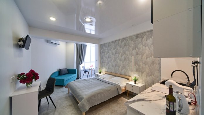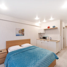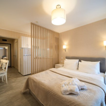 Каждая деталь в апартаментах продумана для Вашего комфорта: современная кухонная зона для приготовления любимых блюд, обеденная зона для уютных завтраков, телевизор для вечернего отдыха и бесплатный Wi-Fi для связи. В Вашем распоряжении холодильник, фен, мягкое постельное белье и банные принадлежности, а также мини-парфюмерия и тапочки для Вашего абсолютного удобства.