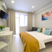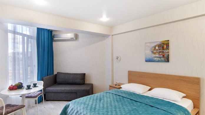 Также в апартаментах предусмотрены телевизор, бесплатный Wi-Fi,индивидуальный климат-контроль, постельное белье, мини-парфюмерия и тапочки.