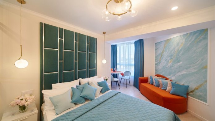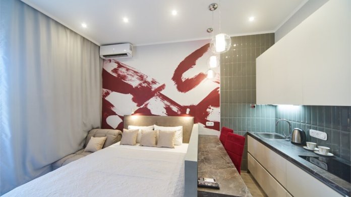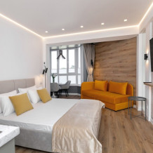 Вас ждёт уютная спальня с удобной двуспальной кроватью и раскладным диваном, что делает эти апартаменты идеальными для одного или двух взрослых, с возможностью организации дополнительного места.