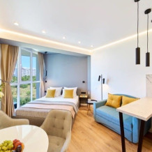 Апартаменты оснащены кроватью «King size», двуспальным раскладным диваном и односпальным раскладным креслом, что делает их идеальным выбором для семьи или небольшой компании.