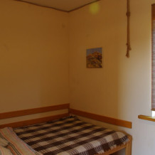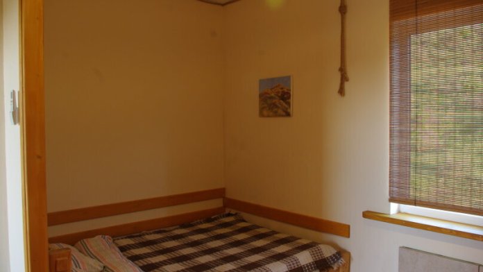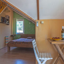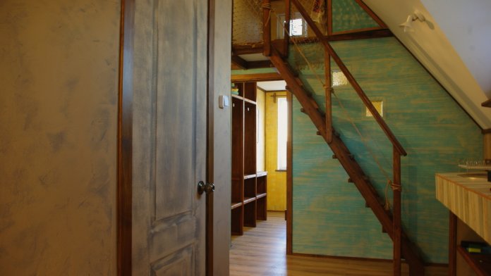 Это самый большой круглогодичный номер нашего мини-отеля. Он рассчитан на шестерых гостей. На первом свете - большая кухня-гостиная с балконом-террасой. Рядом расположен совмещённый санузел и спальня с двуспальной кроватью. На втором свете расположены двуспальная и односпальная кровати, разделенные «мостиком» и шторами
