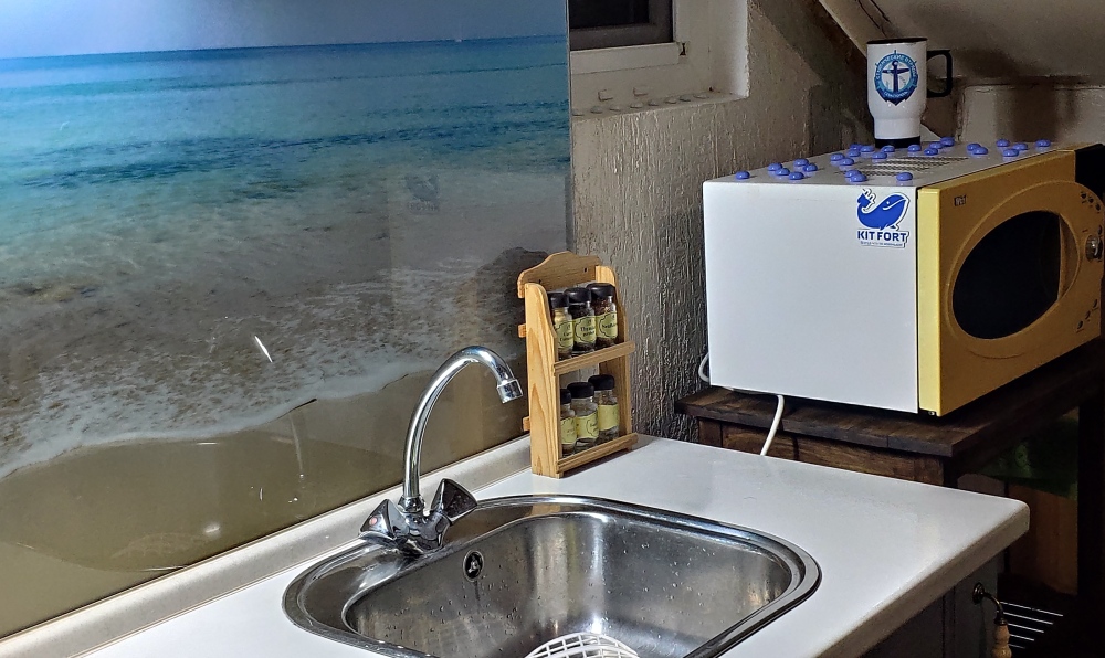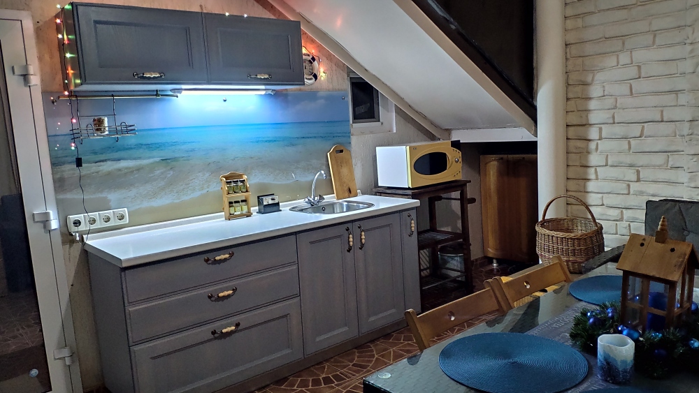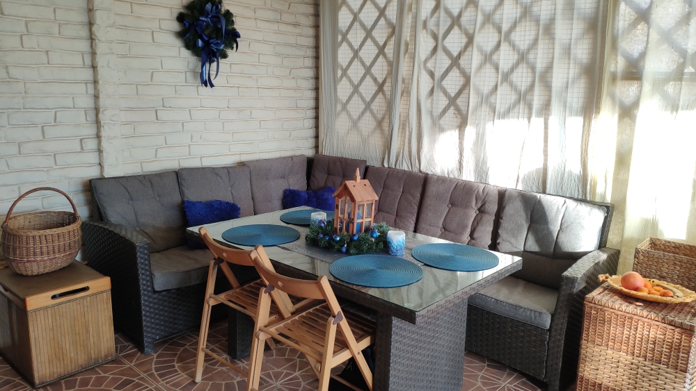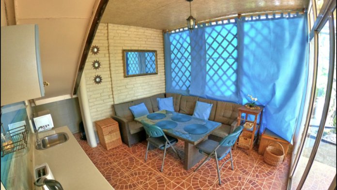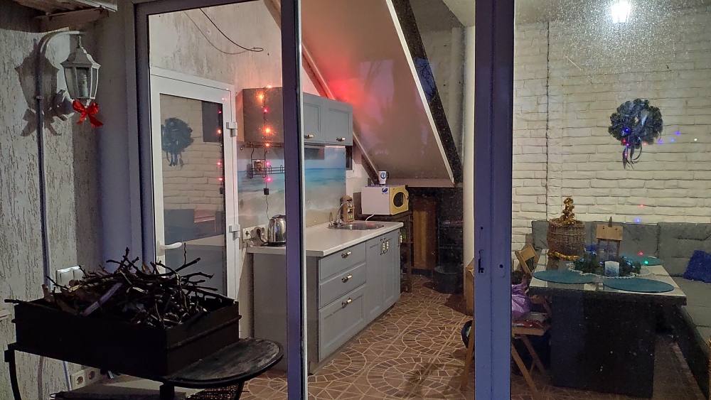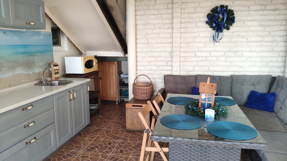 - проветриваемую с панорамным остеклением зону приготовления и приема пищи, включающую кухонную зону, два ротанговых дивана с подушками, ротанговый стол, стулья, укомплектованную техникой и посудой, микроволновка, эл.чайник, индукц.плита;