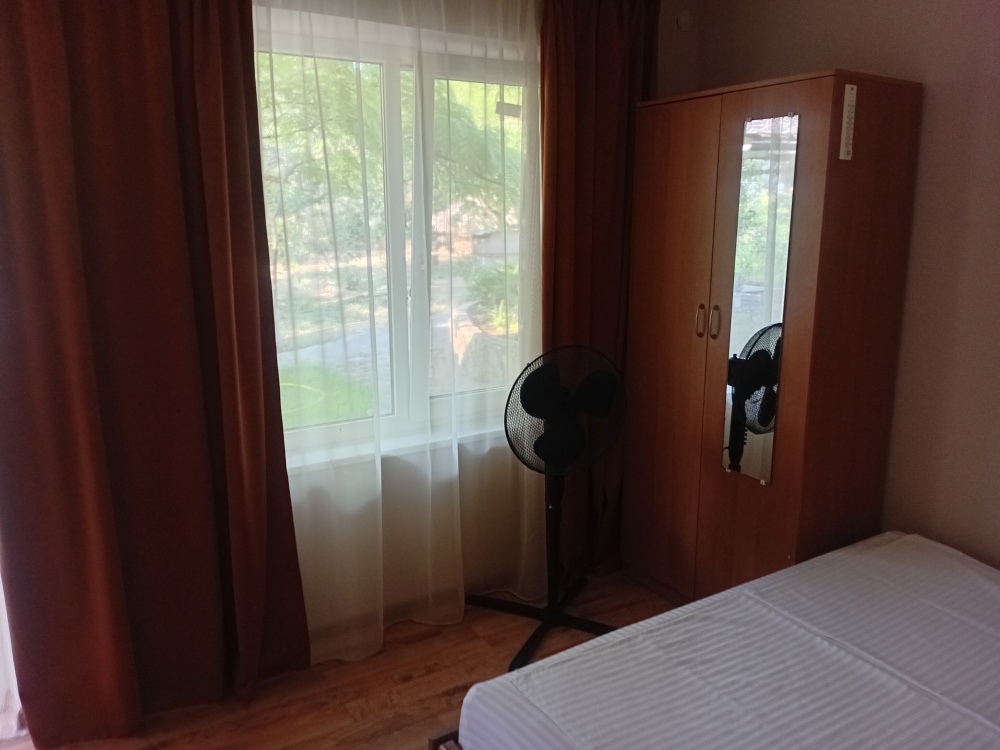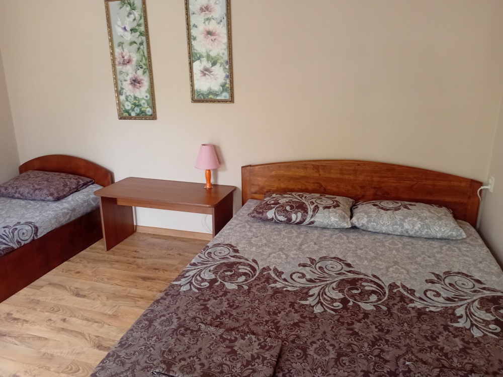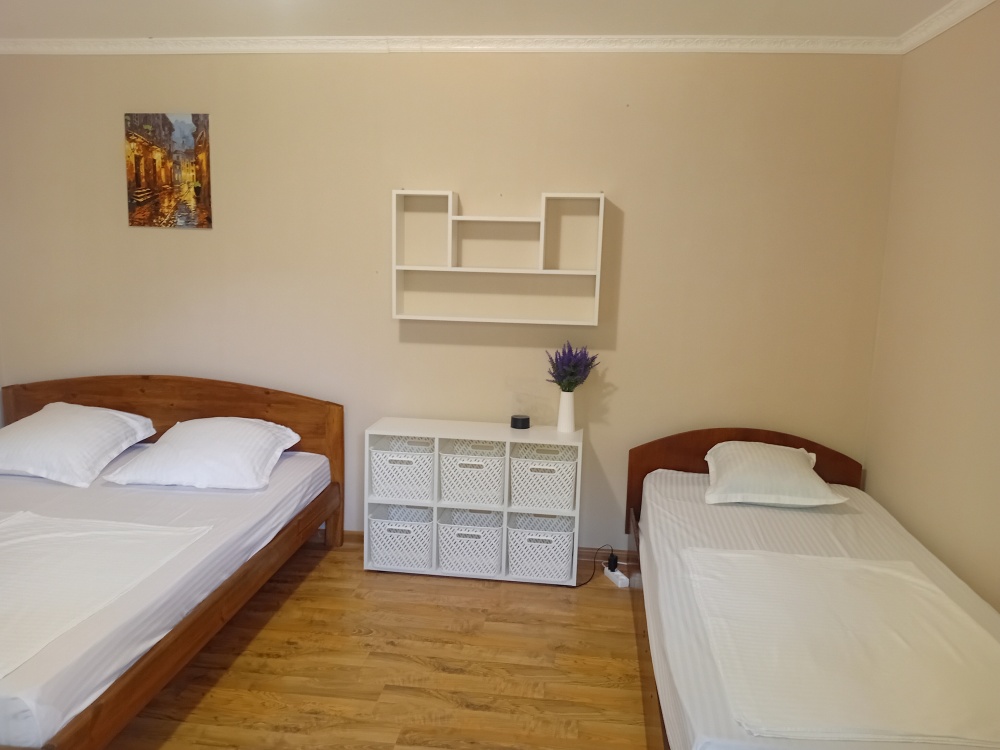 Два номера 3-местных (спальные места 2+1) и один номер 4-местный (спальные места 2+2, однокомнатный). Чистые, светлые номера с мягкими удобными кроватями и матрасами, для крепкого, полноценного сна. Шкаф с плечиками, полочками, зеркалом. С кондиционером. Душ и туалет общие на три номера, с напольным унитазом, горячей водой, рядом с номерами.