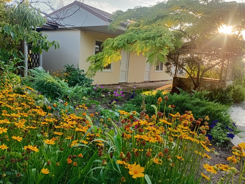 Уютный зеленый тихий, спокойный дворик гостевого дома "Отдых" в Оленевке приглашает на отдых.