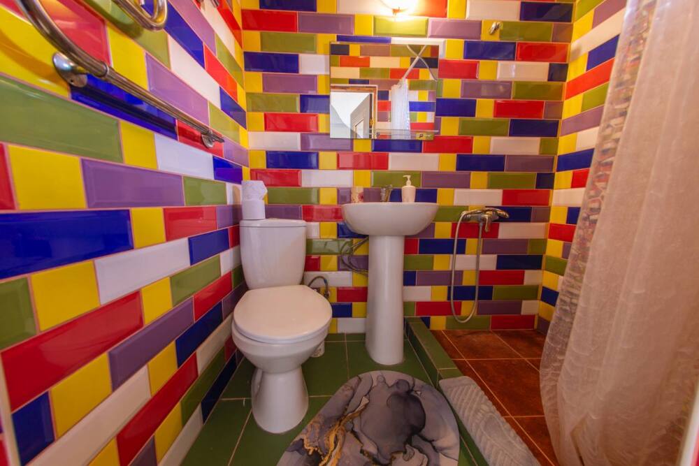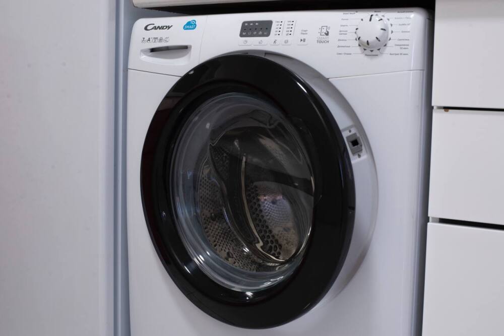Удобства: душ, туалет, раковина, зеркало и стиральная машинка.