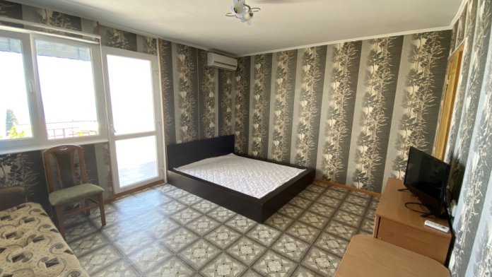 Уютный номер с большой лоджией и видом на море, одно спальное место в комнате, второе на лоджии. Из окон открывает прекрасный вид на море. Холодильник один на два номера, размещен на общей кухне.