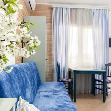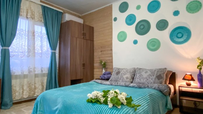 В номере: двухспальная кровать размером 160*200, диван, собственный санузел с душевой кабиной, собственная кухня, вентилятор, обеденный стол, шкаф, холодильник, посуда, чайник, газовая плитка, быстрый интернет.