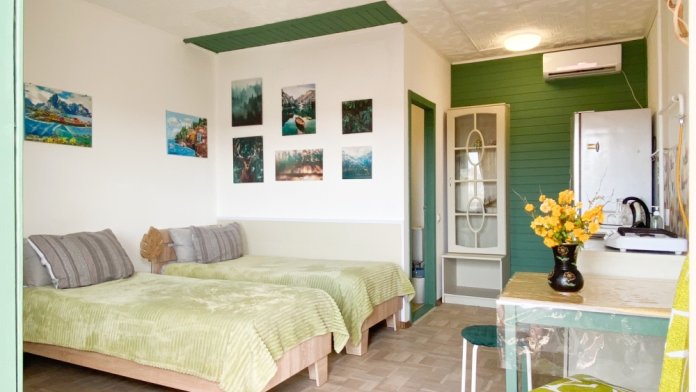 В номере: две односпальные кровати с возможностью их соединения, собственный санузел с душевой кабиной, собственная кухня, кондиционер, обеденный стол, шкаф, холодильник, посуда, чайник, газовая плитка, быстрый интернет.