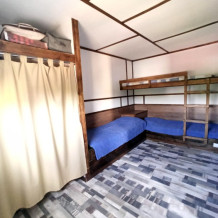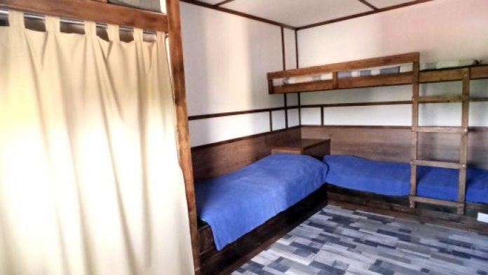 Номер с тремя односпальными кроватями из дерева, одна из которых во втором ярусе.