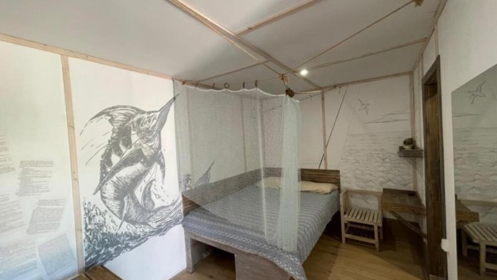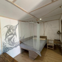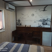 Двуспальная кровать, стилизованная под лодку; холодильник, WI-FI, зеркало, скамья, передвижной стол, компьютерный столик, деревянное кресло. Термодом, сохраняющий комфортную температуру; электрическое отопление (тёплый пол),кондиционер.