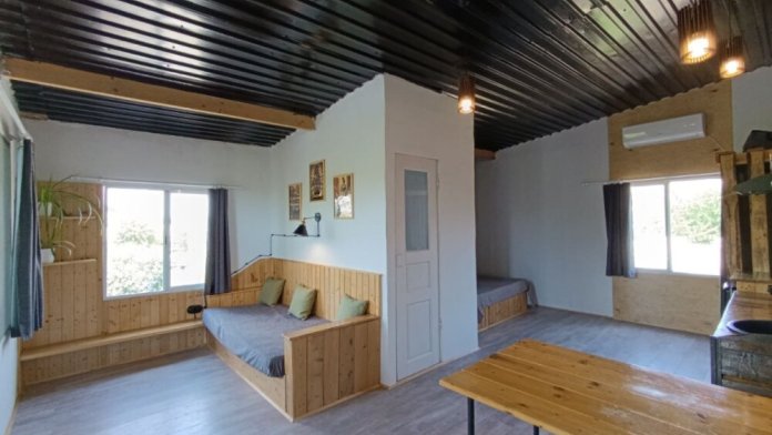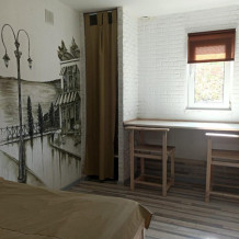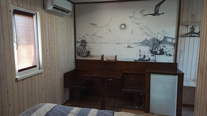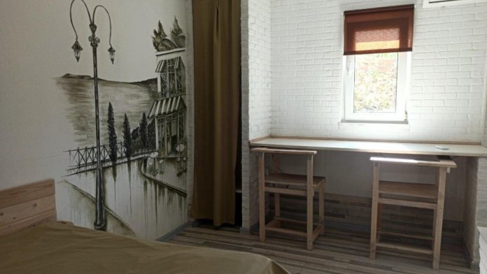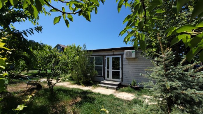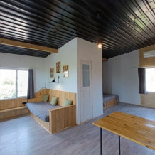 Комната-студия с двуспальной и односпальной кроватями, санузлом (туалет, душ), кухней и террасой, кондиционером. Зона кухни оборудована холодильником, мойкой, плитой, свч-печью, чайником, вытяжкой, столом для приготовления и приёма пищи; имеется вся необходимая посуда. Три раздвижных окна с видом на сад, улицу и террасу. С террасы открывается живописный вид на рядом растущее дерево (сливу) и на близлежащие сады; на террасе есть стол со стульями. Комната с высокими потолками, выполнена в ретро-стиле с натуральным деревом в интерьере. По договорённости возможно проживание с животными.