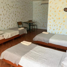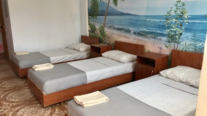 Четырехместный номер с 4 отдельными односпальными кроватями. В номере есть кондиционер, холодильник, душ, туалет, комплект полотенец.