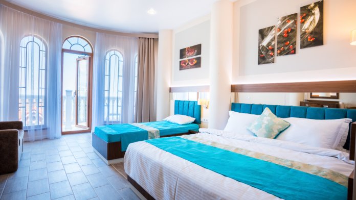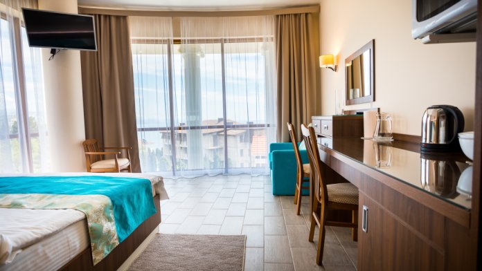Просторный номер с небольшим балконом и видом на море.