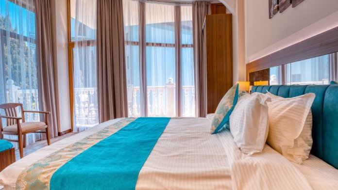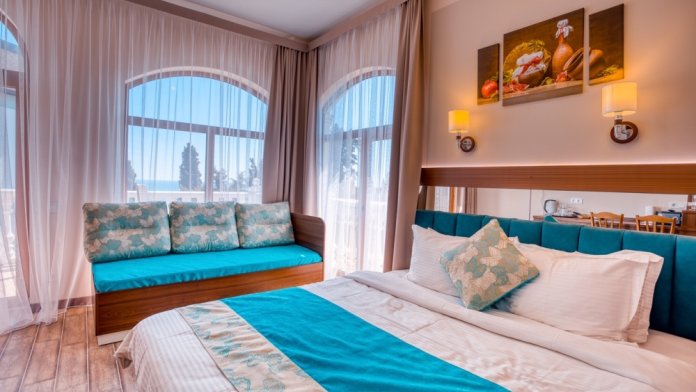 Номер с двуспальной кроватью. Панорамные окна с видом на море и горы. Без балкона.