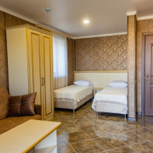 Уютный номер для 1–2 человек, площадью от 20 до 24 м². В комнате: большая кровать, рабочая зона, телевизор, чайник, шкаф. В ванной — душ, фен, туалет, полотенца. Есть кондиционер, Wi-Fi. На этаже — утюг и гладильная доска. Стойка регистрации работает круглосуточно. Уборка — раз в 3 дня, смена белья — раз в 5 дней. Завтрак с 8:00 до 10:00 (дополнительно). В ресторане действует дневное меню. Бесплатно: прачечная, хранение багажа, парковка. Сувениры из Крыма на территории. Дети до 3 лет — бесплатно.
