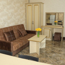 Уютная студия для 2–3 человек, площадью 20–30 м2. В номере: большая кровать, раскладное кресло, кухня с посудой, холодильник, чайник, обеденная зона, телевизор, шкаф. В ванной — душ, фен, санузел, полотенца. Есть кондиционер, бесплатный Wi‑Fi. Утюг и гладильная доска — на этаже.