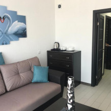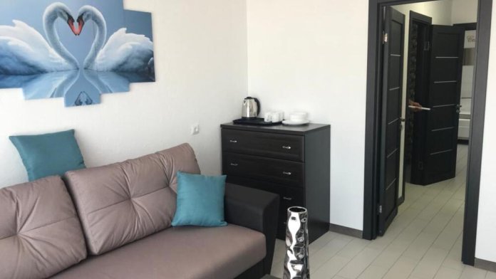 Двухкомнатный номер для 4 гостей(две изолированные комнаты) с двухспальной кроватью и диваном,балконом, кондиционером, электрическим чайником и холодильником, двумя телевизорами с плоским экраном.