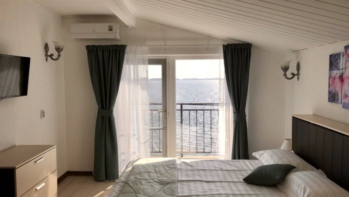 Номер с двуспальной кроватью, балконом, санузлом для двух человек. Имеется холодильник, чайник, кондиционер, белое белье, полотенца, ТВ.
