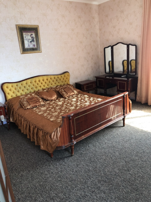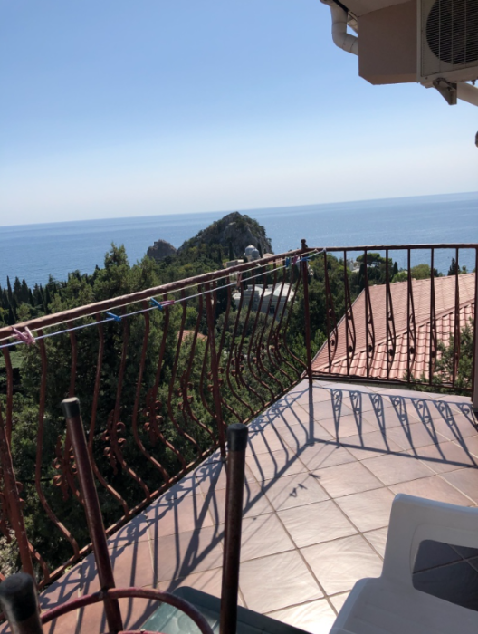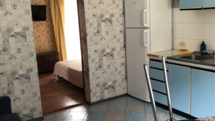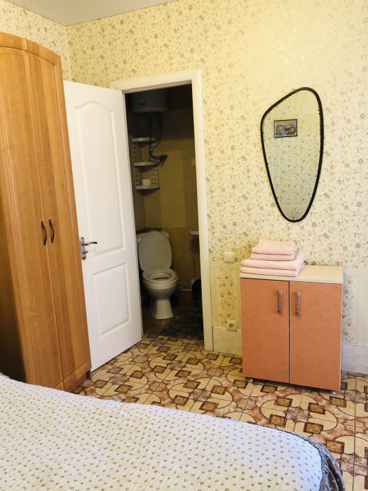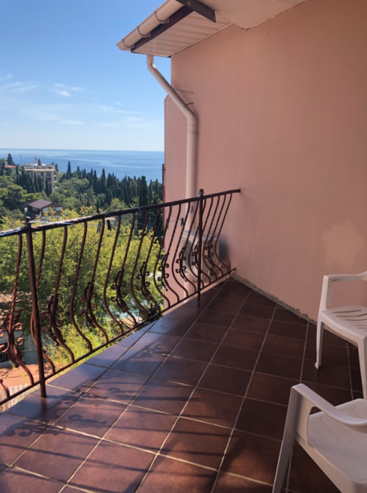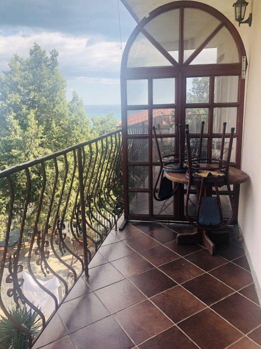 Двухкомнатный номер, комнаты раздельные. В каждой комнате свой санузел (душ, ванная, туалет), двухспальная кровать, телевизор.В одной комнате + односпальная кровать. Большая кухня-столовая, двухспальный диван, кондиционер, холодильник, газовая плита, балкон с видом на море.