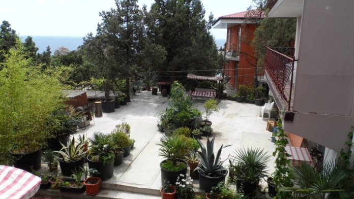 Во дворе находится сад с экзотическими растениями: пальмы, агавы, юкки, кипарисы, реликтовые можжевельники. На территории есть мангал, качели, зоны для отдыха.