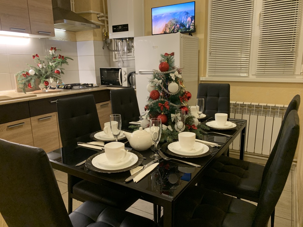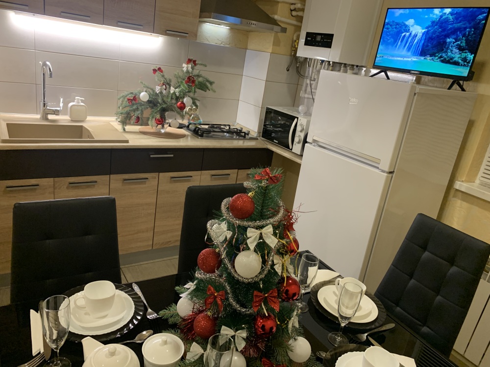 -На кухне полный набор посуды, газовая плита, микроволновка, холодильник, обеденная группа.