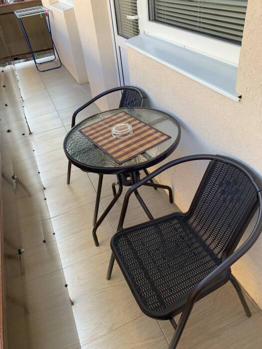 -На балконе стол с креслами для отдыха и сушилка для белья, бельевые тросы во дворе