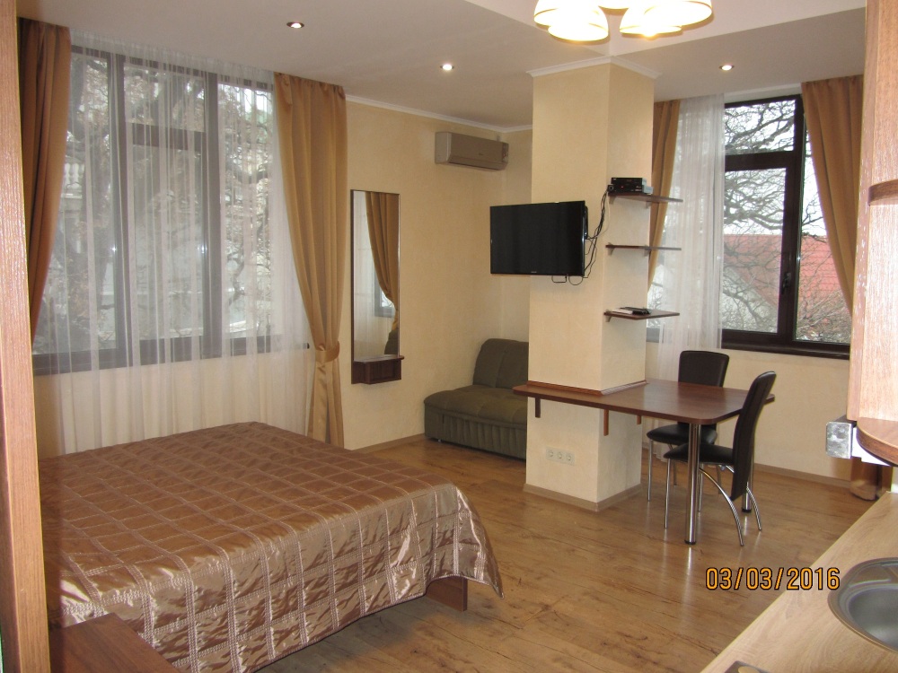 Уютная студия с балконом, полностью оборудована для комфортного отдыха пары или семьи из трех человек.