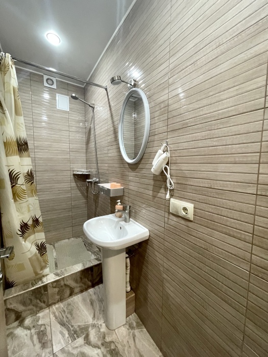Номер удобен для семейной пары с детьми. В номере есть все для удобного отдыха: кондиционер, плазменный телевизор, холодильник, санузел с душем, фен, шкаф.