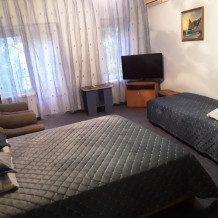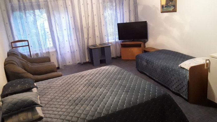 Большой 3 местный просторный номер с кухней и балконом. В номере находятся: 1 двуспальная кровать, 1 односпальная кровать, 2 кресла кровати, душ с бойлером, телевизор, холодильник, кондиционер, журнальный столик.