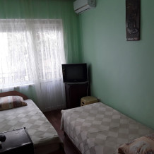 Небольшой однокомнатной номер с 2 односпальными кроватями со всеми удобствами, с кухней и балконом. В номере находится душ с бойлером, телевизор, шкаф и 2 тумбочки.