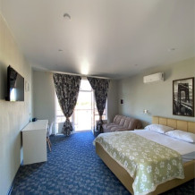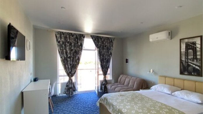Гостям, для проживания, предлагаются номера со всем необходимым для комфортного отдыха. В номере все удобства: холодильник, чайник, посуда, кондиционер, телевизор Smаrt, Wi-Fi, стол, стулья, диван, большой шкаф-купе, кровать с ортопедическим матрасом и подушками, прикроватные тумбы, фен, сейф, санузел.