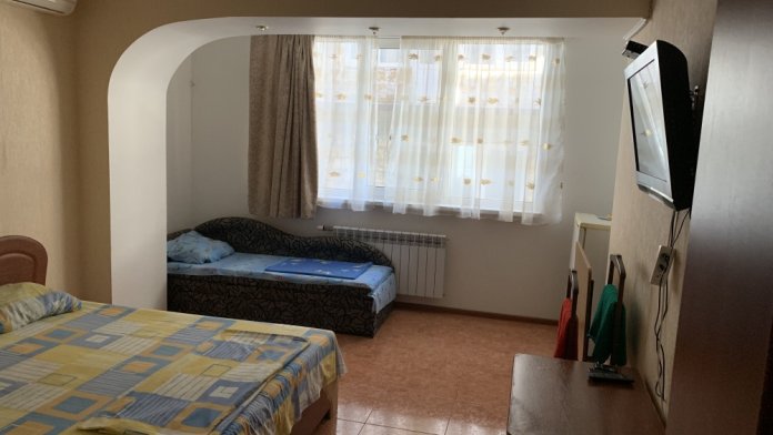 Комфортабельный большой семейный номер с открытым балконом, с видом на море, оснащен всеми удобствами. В номере кондиционер, большая двуспальная кровать, две раскладные кровати, холодильник, чайник, шкаф для одежды, телевизор. Большой балкон со столом и стульями. Ванная комната с душем, горячая и холодная вода круглосуточно. Номер рассчитан на проживание до 4 человек.