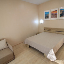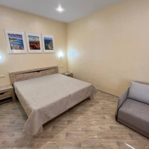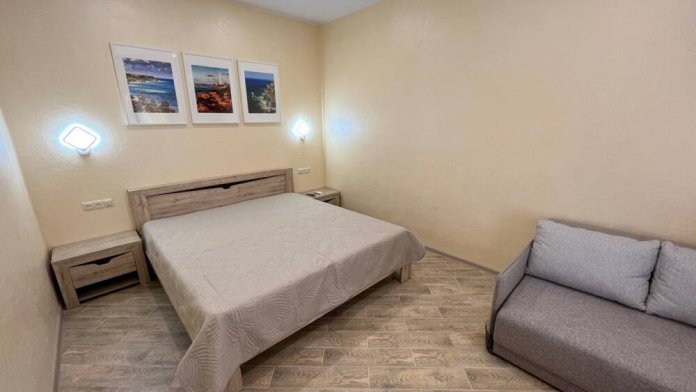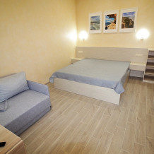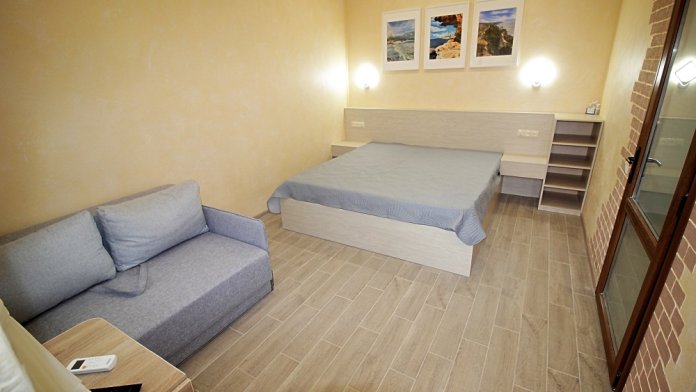 В номере есть: двуспальная кровать с ортопедическим матрасом, односпальное кресло-кровать, кондиционер, холодильник, шкаф, журнальный столик, Wi-Fi, современная сантехника и мебель, телевизор (кабельное телевидение), санузел, набор постельного белья и полотенец для каждого гостя, средства личной гигиены, сушилка для белья.