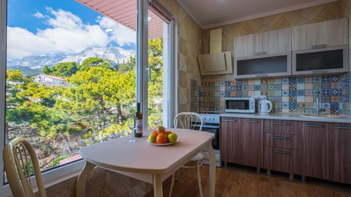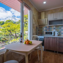 И каждое утро, за чашечкой кофе, вас будет радовать красивейший вид на море и горы. А ещё может и компания весёлых бельчат, порадует Вас прыгая по деревьях напротив окон .