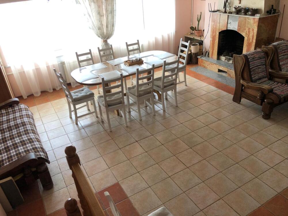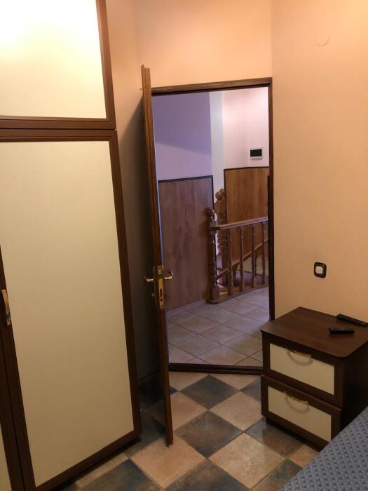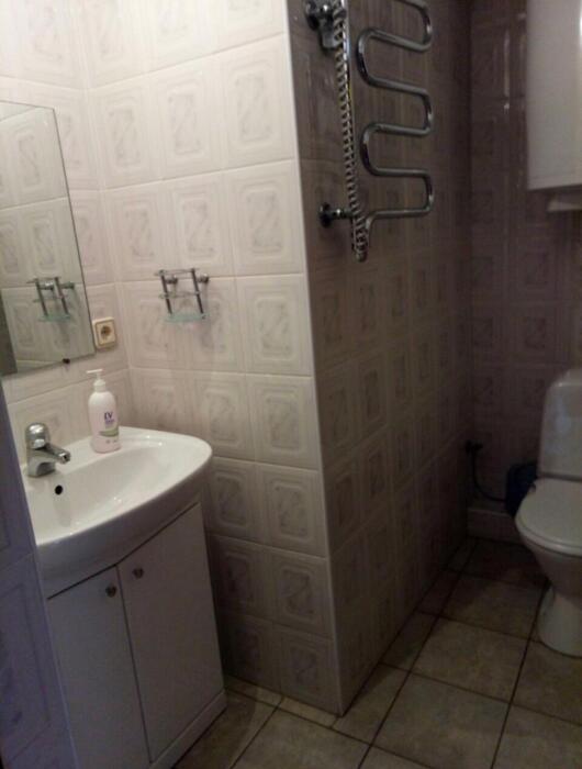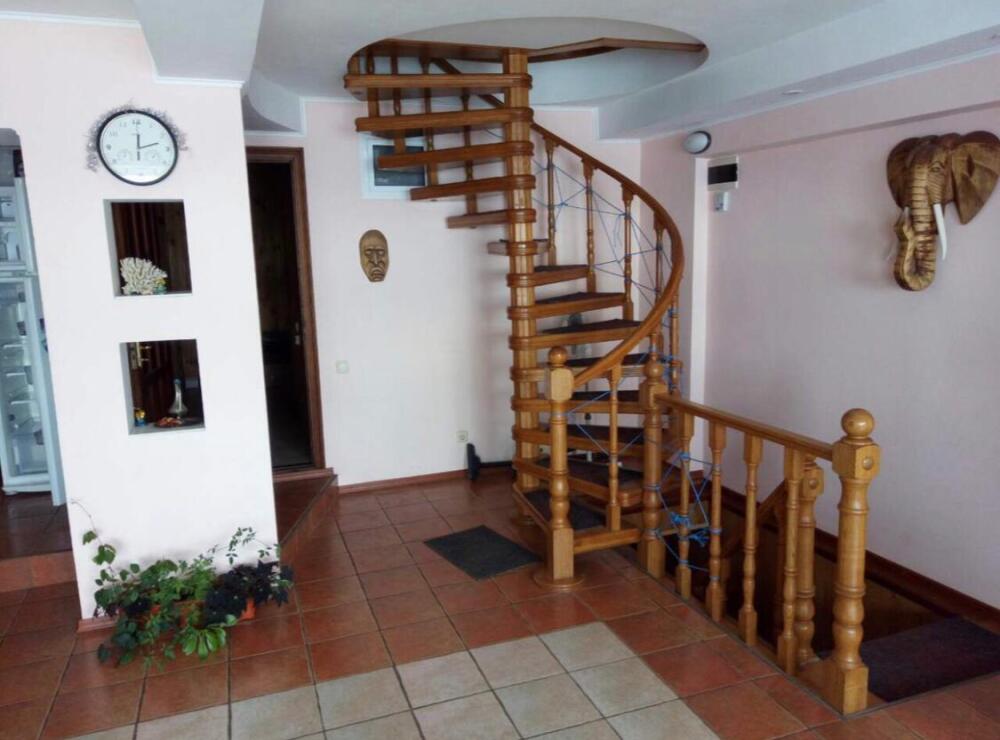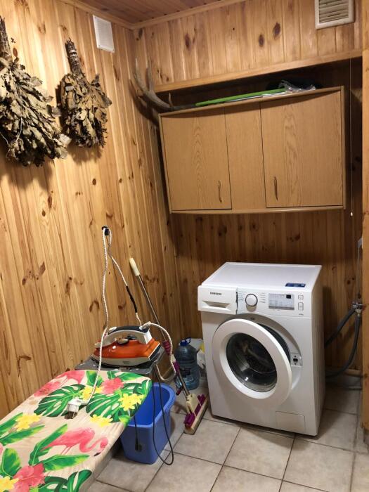 На первом этаже просторная кухня - столовая с мягкой мебелью (варочная панель, посуда, холодильник, микроволновка, телевизор), сауна, санузел, душевая кабина, стиральная машина, гладильная доска, утюг.