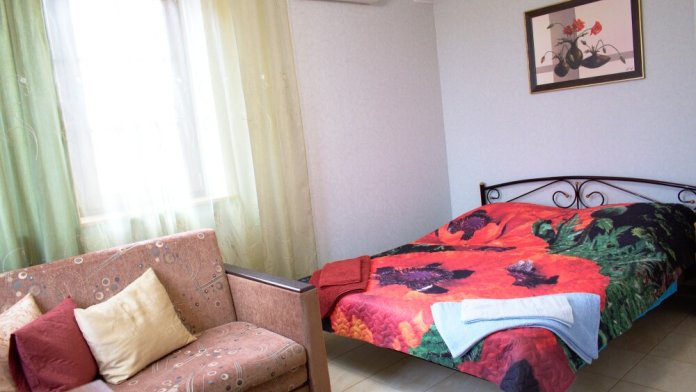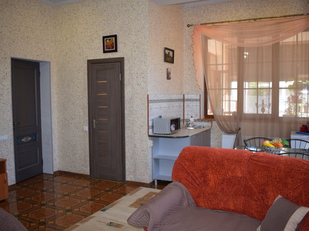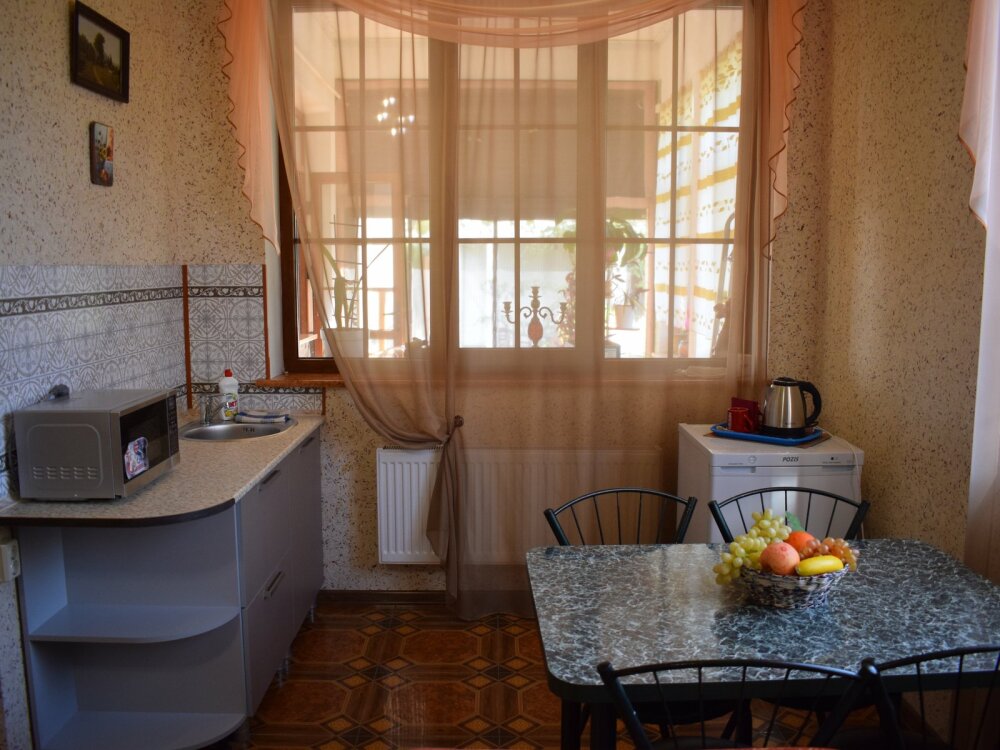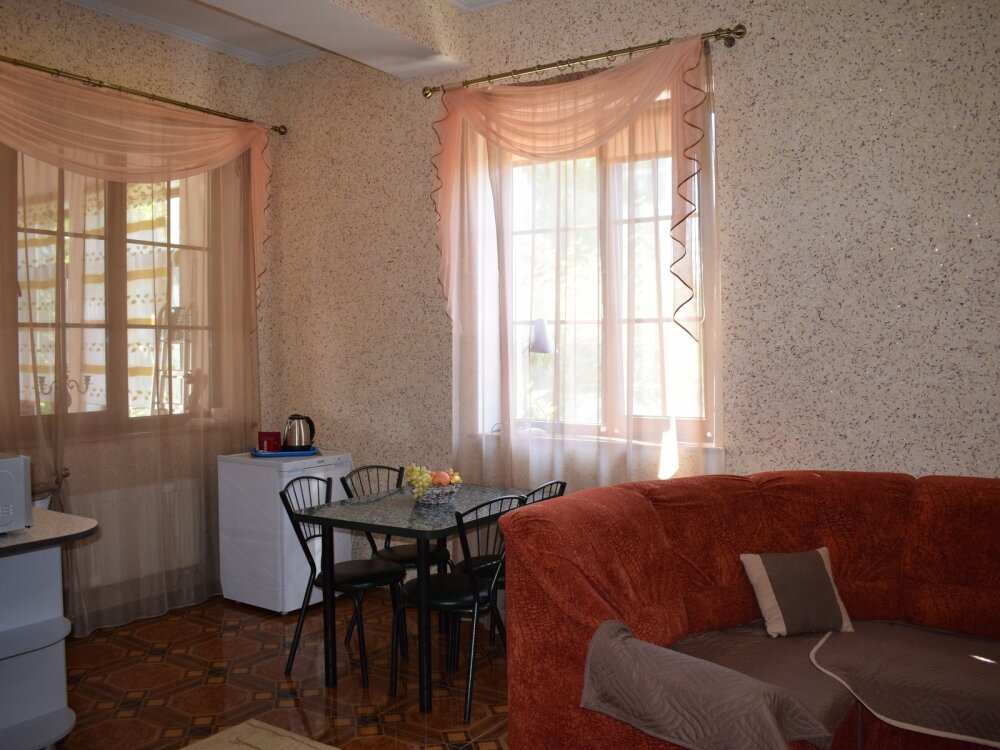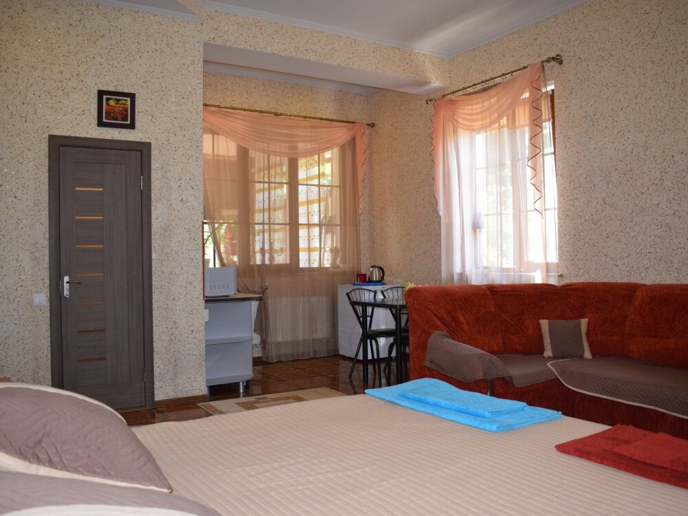 Отличный просторный номер для четырех человек (с возможностью размещения еще одного человека). Большая двухспальная кровать и диван-кровать. Также в номере есть балкон. В номере есть все для полноценного и комфортного отдыха в Феодосии. Уютный зеленый дворик, детская площадка, летняя кухня, водоем с рыбками - это все поможет вам полностью расслабиться, забыть обо всем, кроме отдыха.