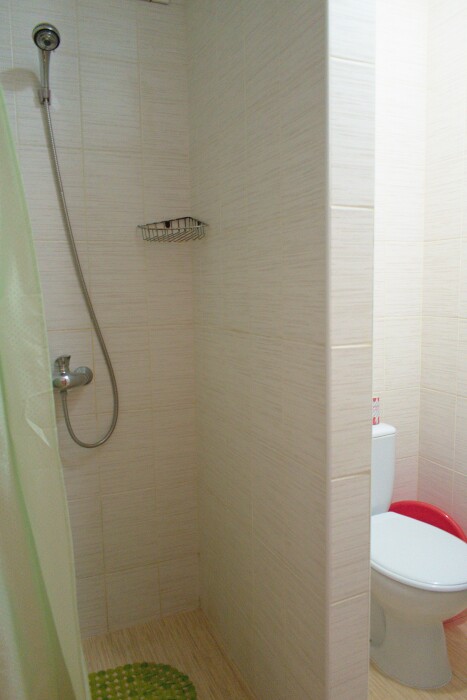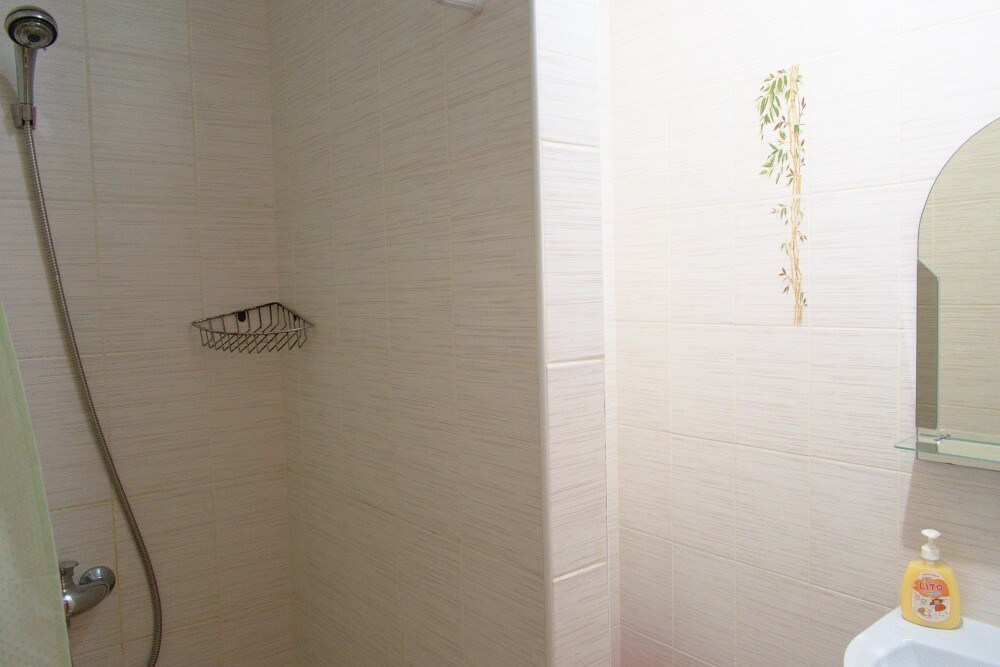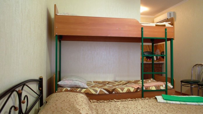 Уютный и недорогой семейный номер, в нем имеется одна большая двухспальная кровать и двухъярусная кровать, которая отлично подойдет детям. Большой зеленый двор, оборудованная детская площадка, искусственный водоем с рыбками — все для отличного семейного отдыха вечером, после посещения песчаного пляжа, который находится в 10 минутах от гостевого дома.