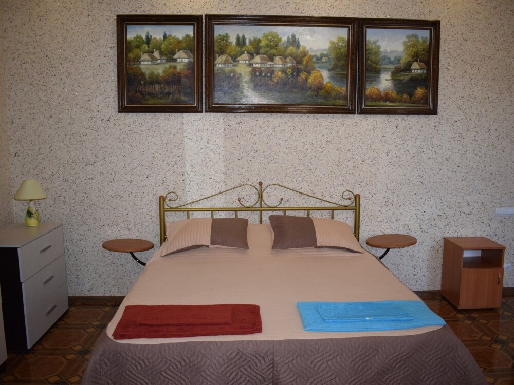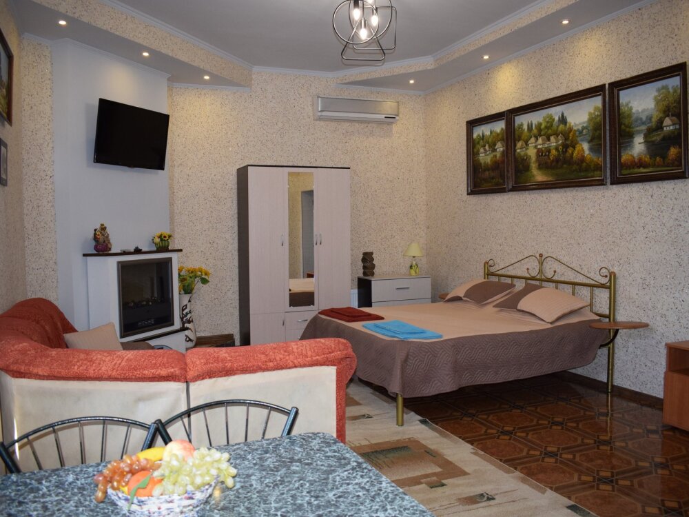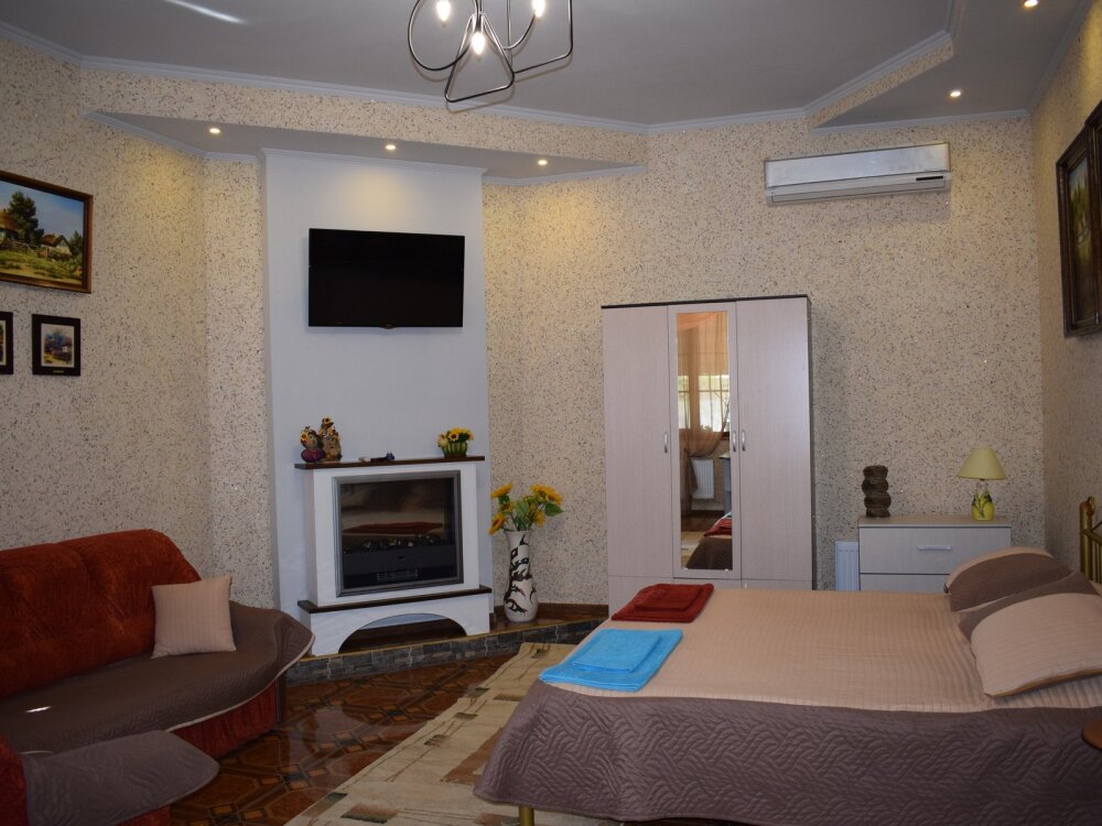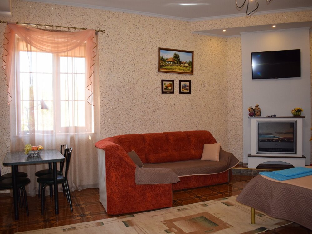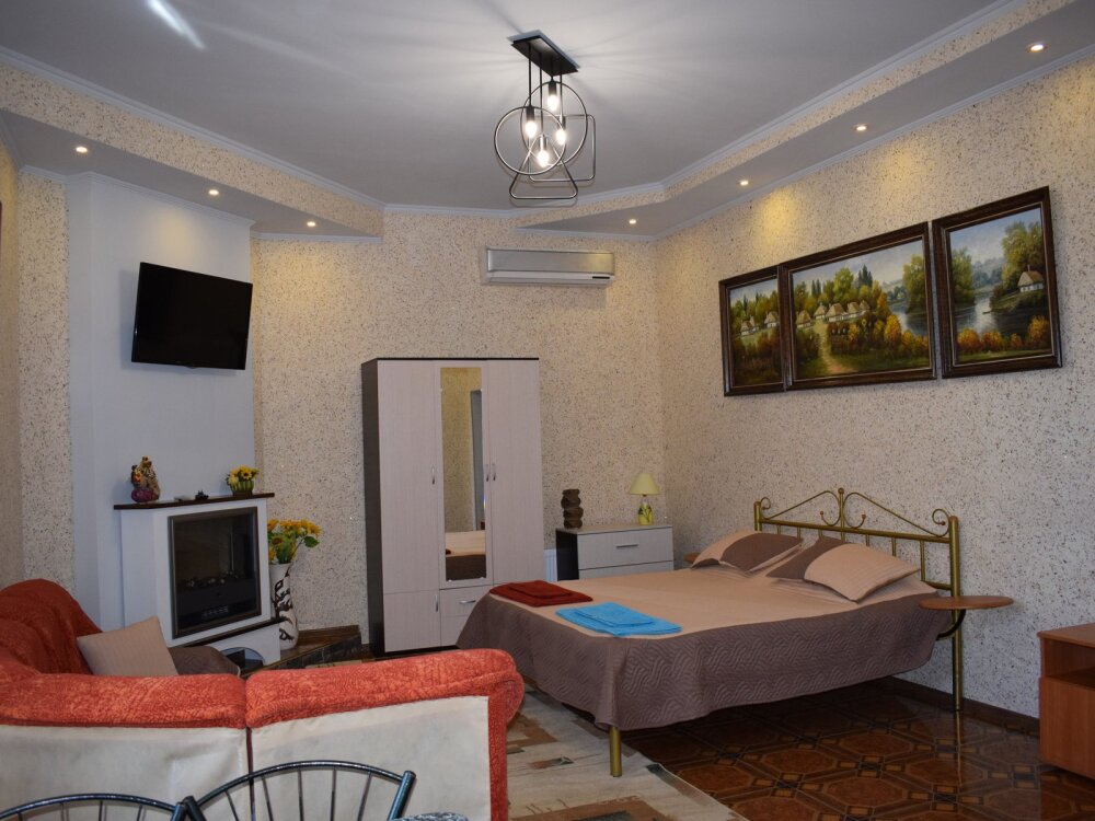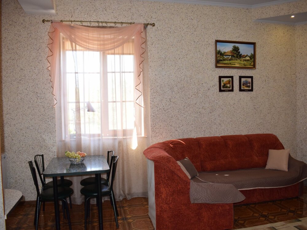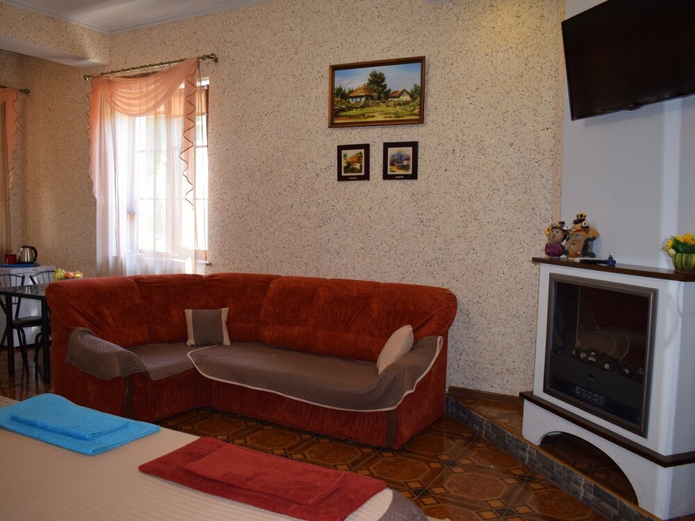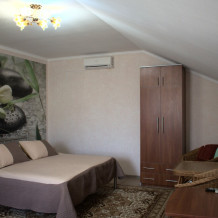 Двухуровневый комфортабельный номер, рассчитанный на размещение до 4-х человек. На первом этаже расположена одна двухспальная кровать, на втором - 2 односпальных дивана. Также в комнате на втором этаже имеется отдельный балкон. Уютный зеленый дворик, детская площадка, летняя кухня, водоем с рыбками - это все поможет вам полностью расслабиться, забыть обо всем, кроме отдыха.