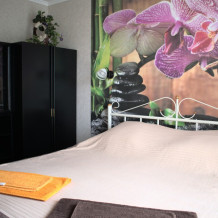 Уютный и недорогой семейный номер до 4-х человек. В нем имеется одна большая двухспальная кровать и раскладной двухспальный диван, который отлично подойдет детям. Для вашего удобства в номере имеется мини-кухня, микроволновая печь, посуда, холодильник, обеденный стол.
